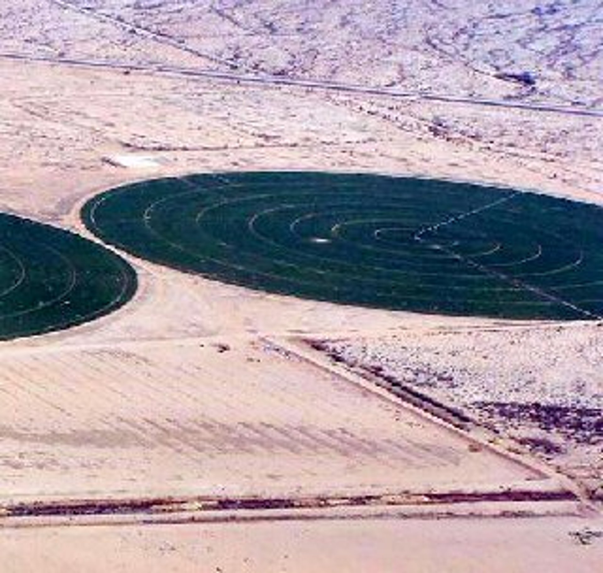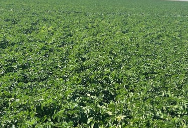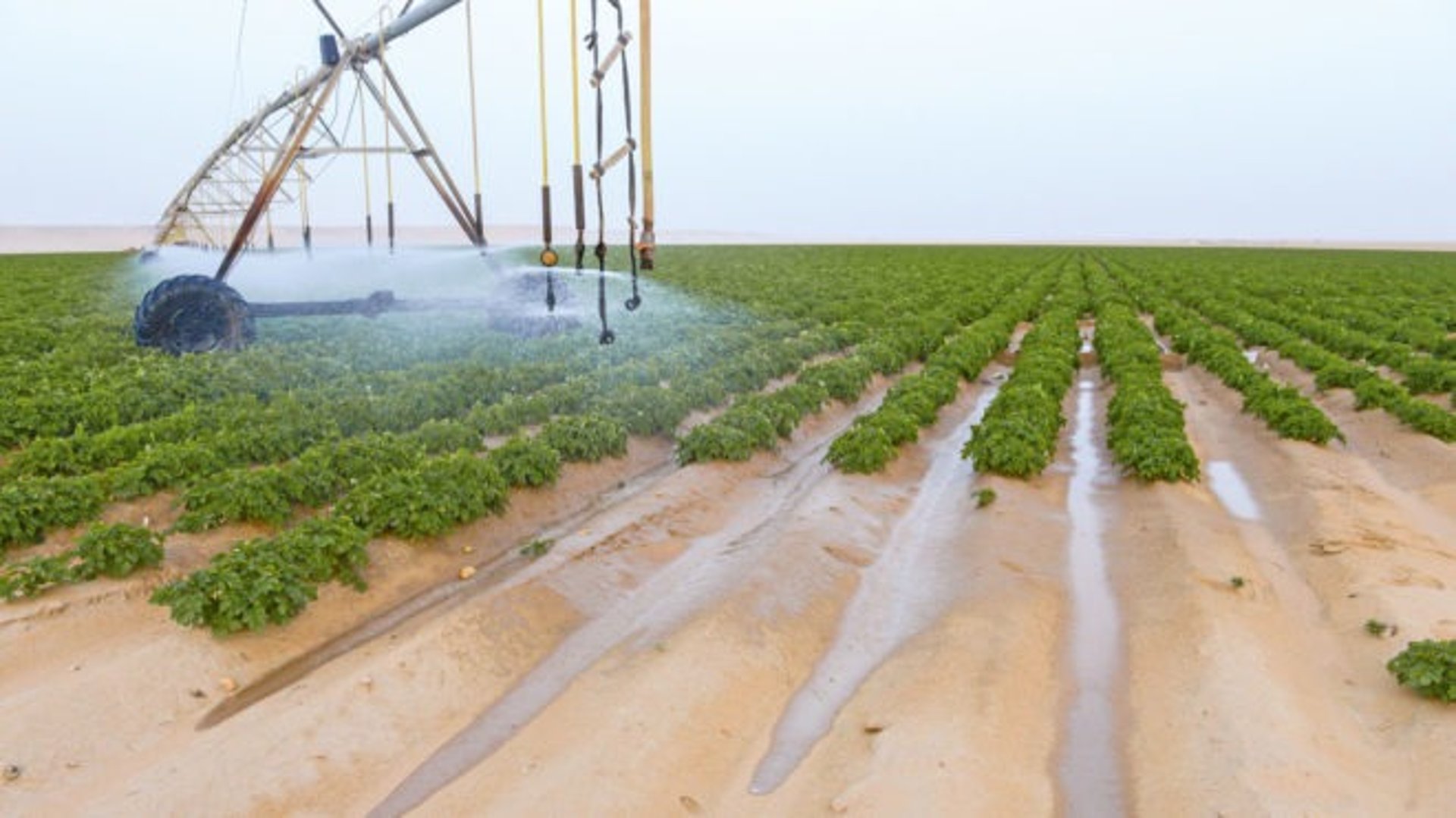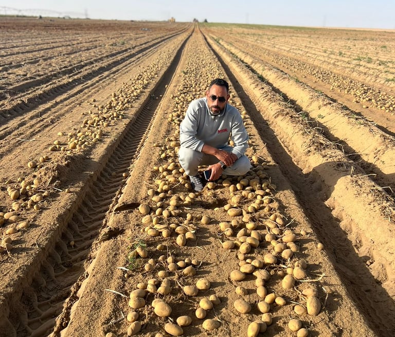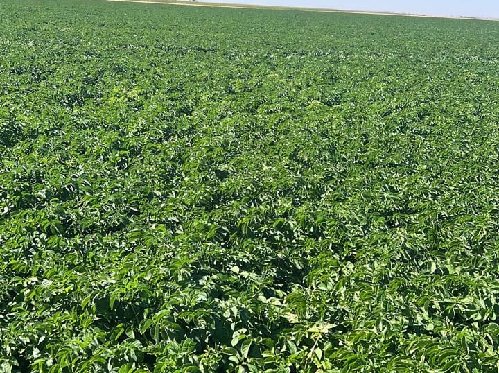 زراعة محاصيل مثل البطاطس والقمح باستخدام أنظمة الري المحوري المتطورة.