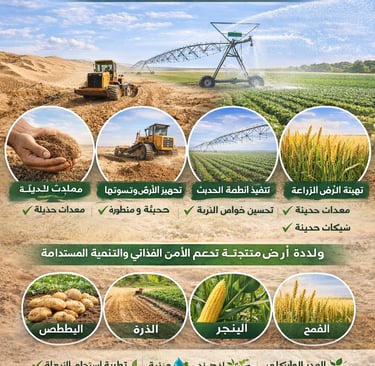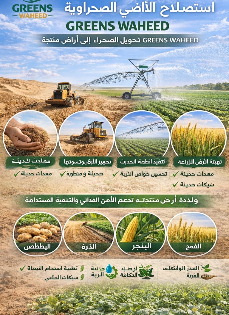 رؤية شركة GREENS WAHEED لتحويل الصحراء إلى أراضٍ منتجة تُعد شركة GREENS WAHEED من الشركات الرائدة في مجال استصلاح الأراضي الزراعية، حيث تعتمد على أحدث المعدات والتقنيات الحديثة لتحويل الأراضي الصحراوية القاحلة إلى أراضٍ صالحة للزراعة والإنتاج، بما يساهم في دعم الأمن الغذائي وتحقيق التنمية الزراعية المستدامة.